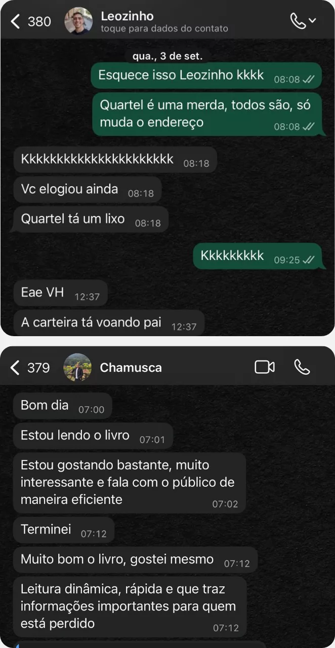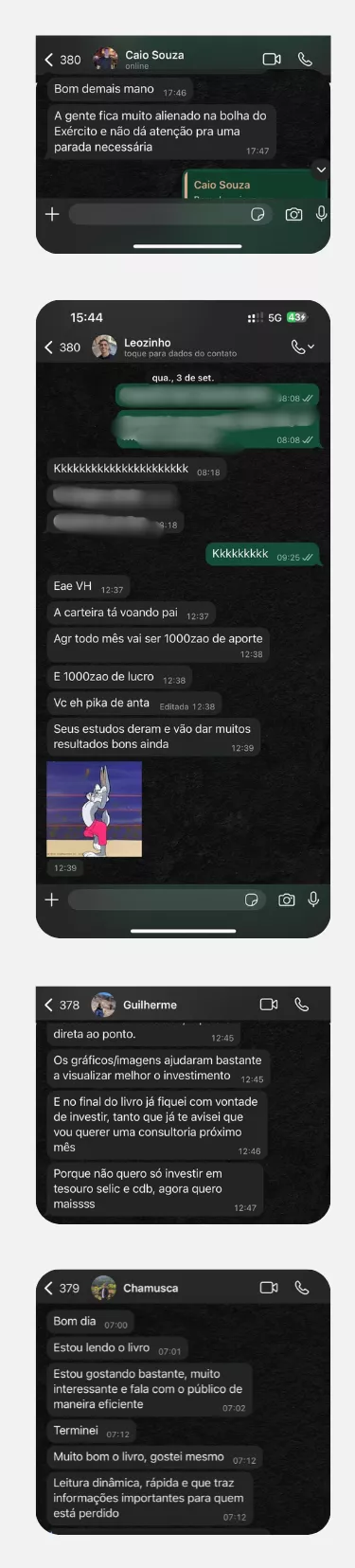Não precisa acreditar só em mim. Veja como esse plano já ajudou outros militares, que viviam a mesma rotina de serviço, missões e incertezas, a conquistarem clareza financeira e começarem a investir com segurança.